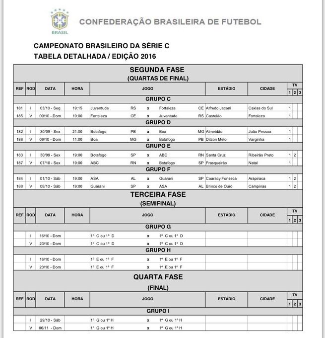 CBF DIVULGA TABELA DAS QUARTAS DE FINAIS DA SÉRIE "C" DO BRASILERÃO 2016 !!!